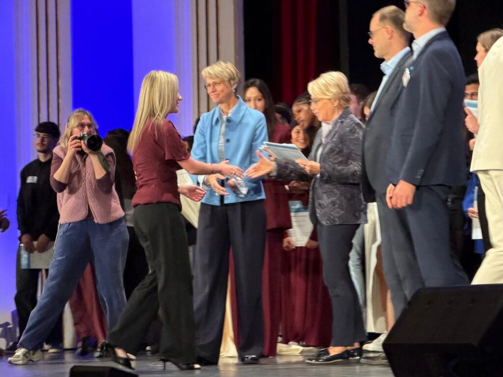 Die diesjährige Aufnahmefeier des RuhrTalente-Stipendienprogramms fand in der eindrucksvollen Kulisse der Lichtburg in Essen statt und bot erneut einen festlichen Rahmen für die Förderung engagierter junger Menschen aus dem Ruhrgebiet. Unsere Schule freut sich, dass in diesem Jahr zwei Schülerinnen des Jahrgangs Q1 – Melissa und Ela-Naz – in das renommierte Programm aufgenommen wurden. Beide überzeugten durch ihre persönlichen Profile, ihr schulisches Engagement und ihre Bereitschaft, Verantwortung innerhalb und außerhalb des Unterrichts zu übernehmen. Ihre Urkunden erhielten sie von der nordrhein-westfälischen Bildungsministerin Dorothee Feller und Frau Bärbel Bergerhoff-Wodopia. vom Vorstand der RAG-Stiftung.