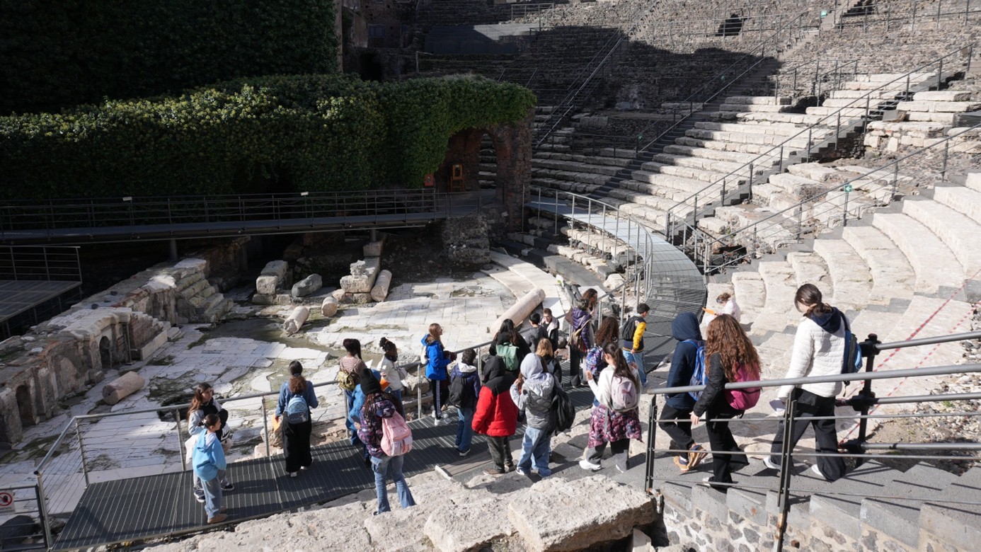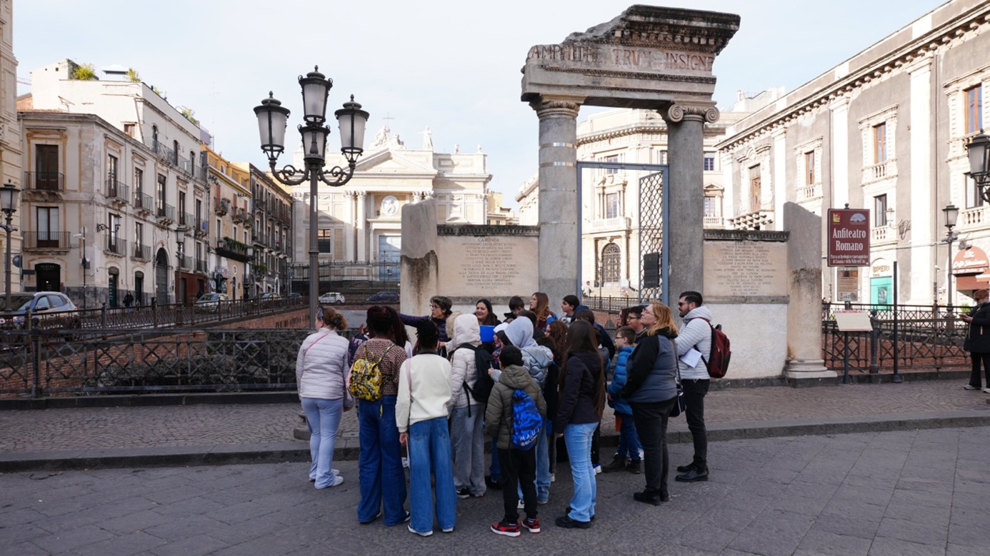 Am Donnerstag stand dann noch einmal die Erkundung Catanias im Vordergrund. Hier besichtigten wir die historische Altstadt mit ihren zahlreichen beeindruckenden Bauwerken. Begleitet wurde unser Programm erneut von den italienischen Schüler*innen, die an verschiedenen Plätzen kurze Theaterszenen für uns vorbereitet hatten. Besonders in den Ruinen der Theater Catanias wirkten diese ganz besonders beeindruckend. Im Anschluss an die Erkundung der Altstadt war es schließlich Zeit, sich von den italienischen Schüler*innen zu verabschieden. Unsere Schüler*innen tauschten gemeinsam Nummern mit ihnen aus, sodass die neu geschlossenen Freundschaften auch in Zukunft weitergeführt werden können.