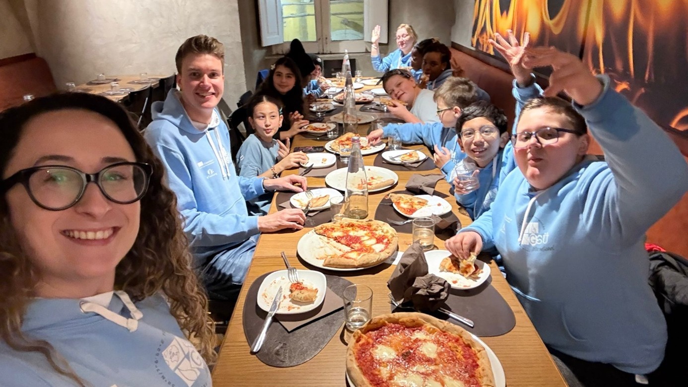 Die Reise startete am Montag mit einer gemeinsamen Zugfahrt zum Düsseldorfer Flughafen, von wo aus wir nach Sizilien aufbrachen. Für einige unserer Schüler*innen war dies die erste Flugreise und somit mit großer Spannung verbunden. Alle Schüler*innen meisterten diese erste große Aufgabe und konnten somit bereits zu Beginn der Reise sehr stolz auf sich sein. Am Flughafen in Catania wartete dann eine Überraschung auf uns, denn wir wurden herzlich von italienischen Schüler*innen, Lehrkräften, Eltern und Erziehungsberechtigten empfangen. Im Anschluss an diese tolle Geste bezogen wir unser Hotel und machten uns auf Wunsch der Schüler*innen direkt mit italienischer Pizza vertraut.