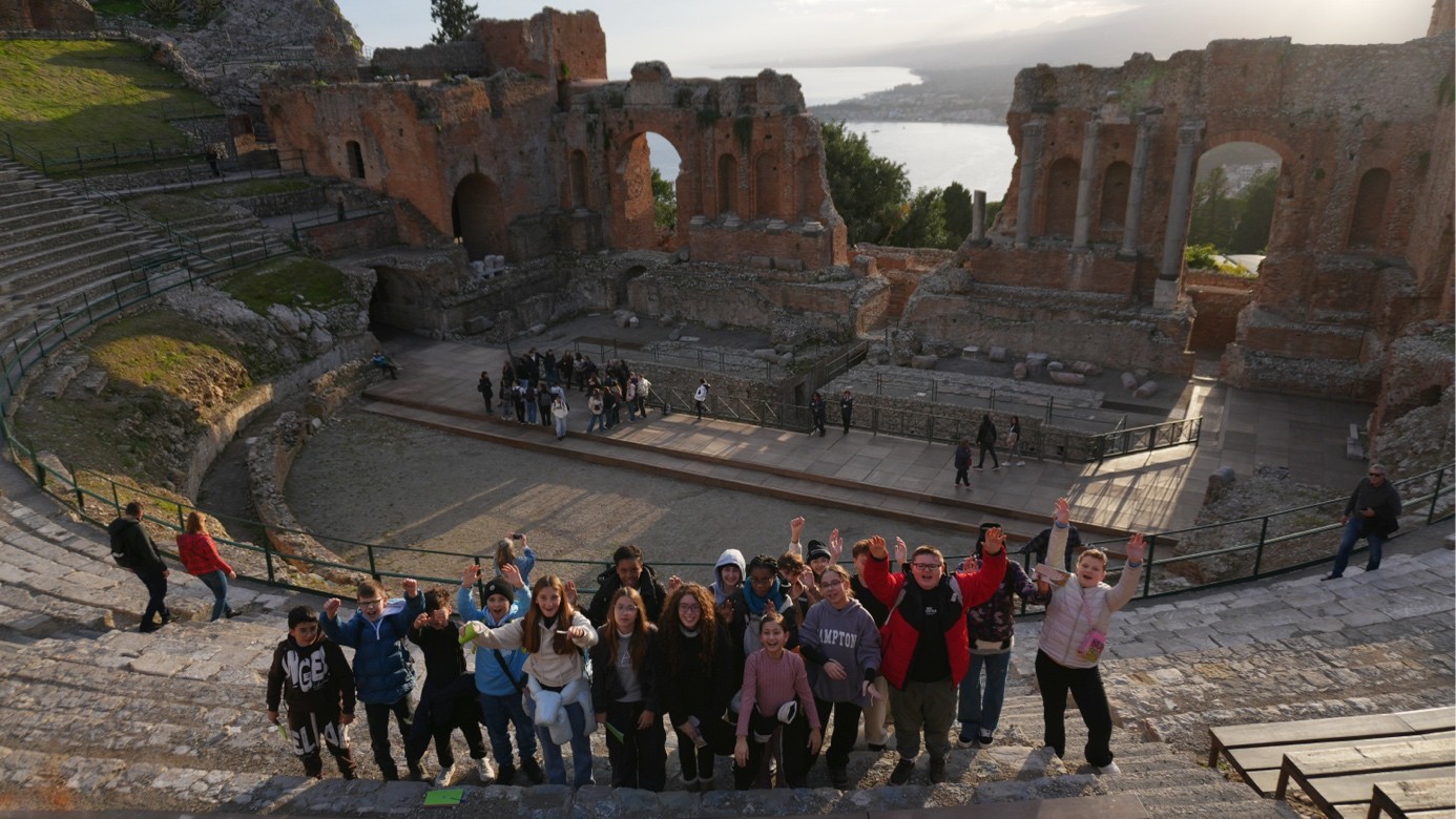 Am Mittwoch reisten wir mit den italienischen Schüler*innen zu einem der wichtigsten Wahrzeichen Siziliens, dem Ätna. Während einer geführten Wanderung erhielten wir viele spannende Informationen zur Geschichte des Ätna sowie zum Thema Vulkane. Auch hier wuchsen viele Schülerinnen und Schüler über sich hinaus und wurden mit einem tollen Ausblick über Sizilien belohnt. Im Anschluss erfolgte eine Besichtigung der wunderschönen Stadt Taormina, die mit einer Schnitzeljagd verbunden war. Hier besuchten wir unter anderem das antike Theater sowie die Piazza IX Aprile.
