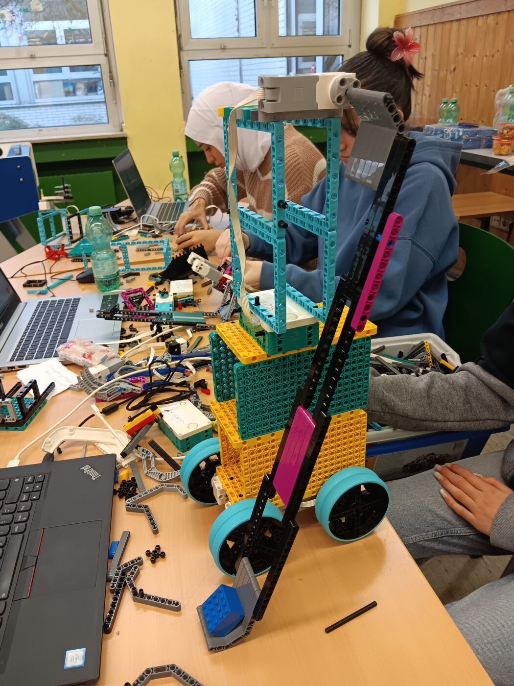 An Tag zwei ging es hoch hinaus: der Roboter hatte nun die Aufgabe, einen Quader aus vier Legosteinen so weit wie möglichen durch die Luft zu befördern. Hier reichten die Lösungsansätze von künstlichen Katapulten über Robotertürmen zur Erhöhung des Startpunktes bin hin zu mechanischen Diskuswerfern, bei denen der Roboter sich erst mehrfach im Kreis drehte, bevor er den Quader losließ. Frei nach Salvador Dali verbanden unsere SchülerInnen durch die im Laufe des Bauens und Programmierens immer weiter fliegenden Quader Klugheit mit Ehrgeiz: „Intelligenz ohne Ambition ist wie ein Vogel ohne Flügel“.