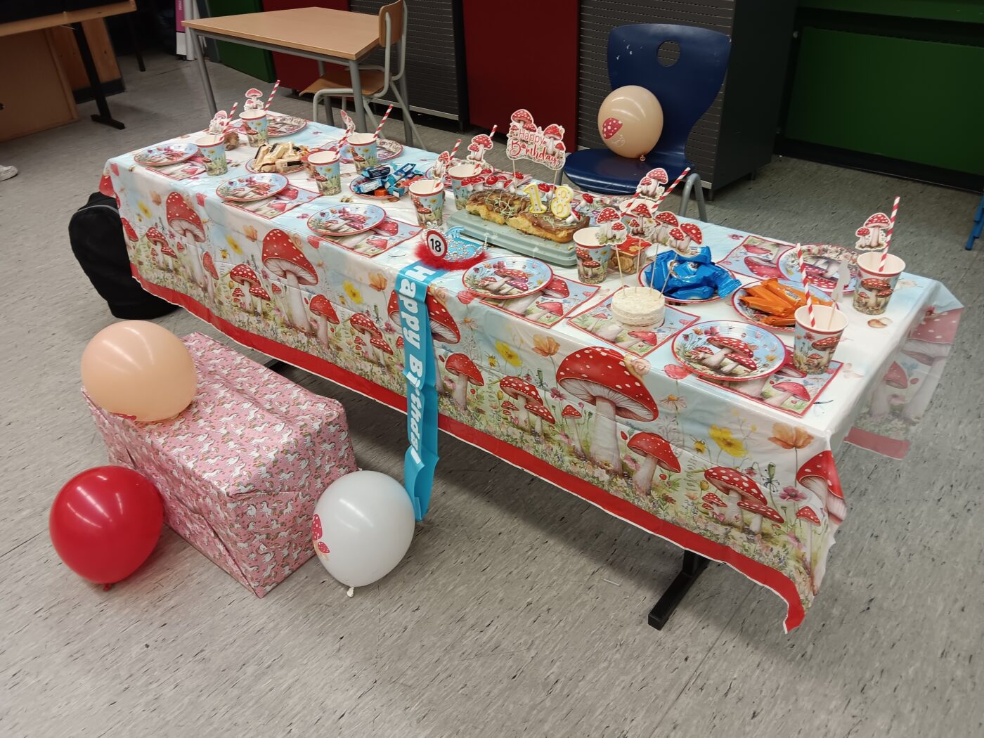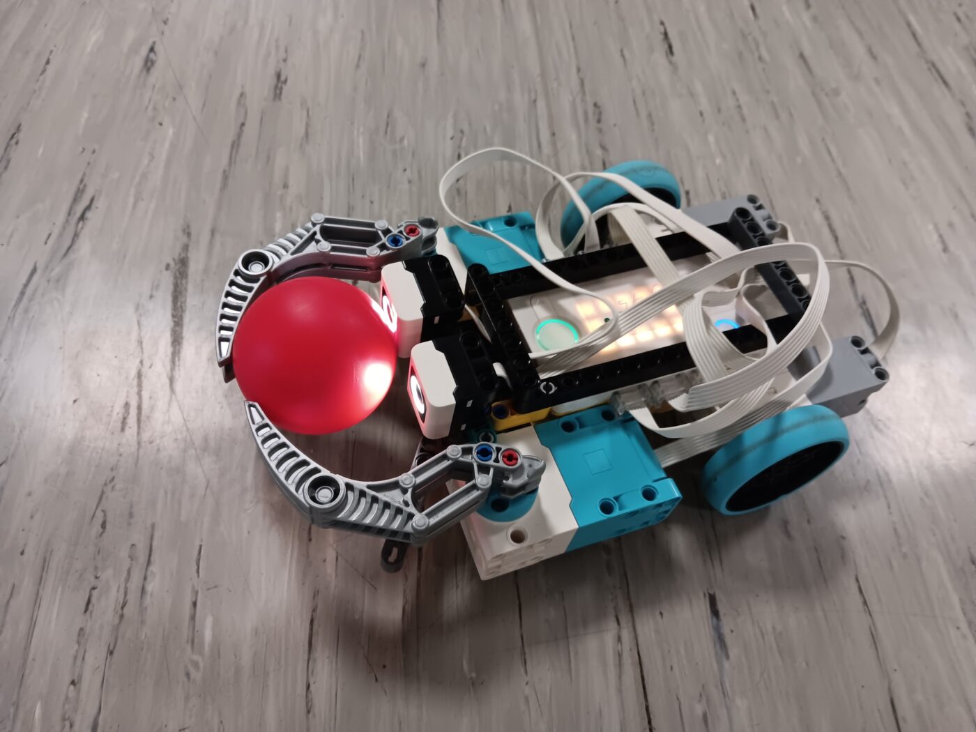 Der Samstag begann dann feierlicher als gewohnt: da unser Teamkapitän 18 Jahre alt wurde, haben die anderen AG-Teilnehmer den Raum feierlich geschmückt und ein nahrhaftes Kuchenfrühstück vorbereitet. Danach ging es ans Arbeiten: ein Roboter sollte einen Ball von einem Reifen heben und ihn über die Ziellinien bringen. Hierbei kamen Ultraschall – und Farbsensoren zum Einsatz, um die Position des Balls und den Abstand des Roboters dazu erfassen und bestimmen zu können. Das Abstimmen von Sensorik und Motoren war dabei ebenso eine Herausforderung wie die Abwägung zwischen Geschwindigkeit und Präzision.