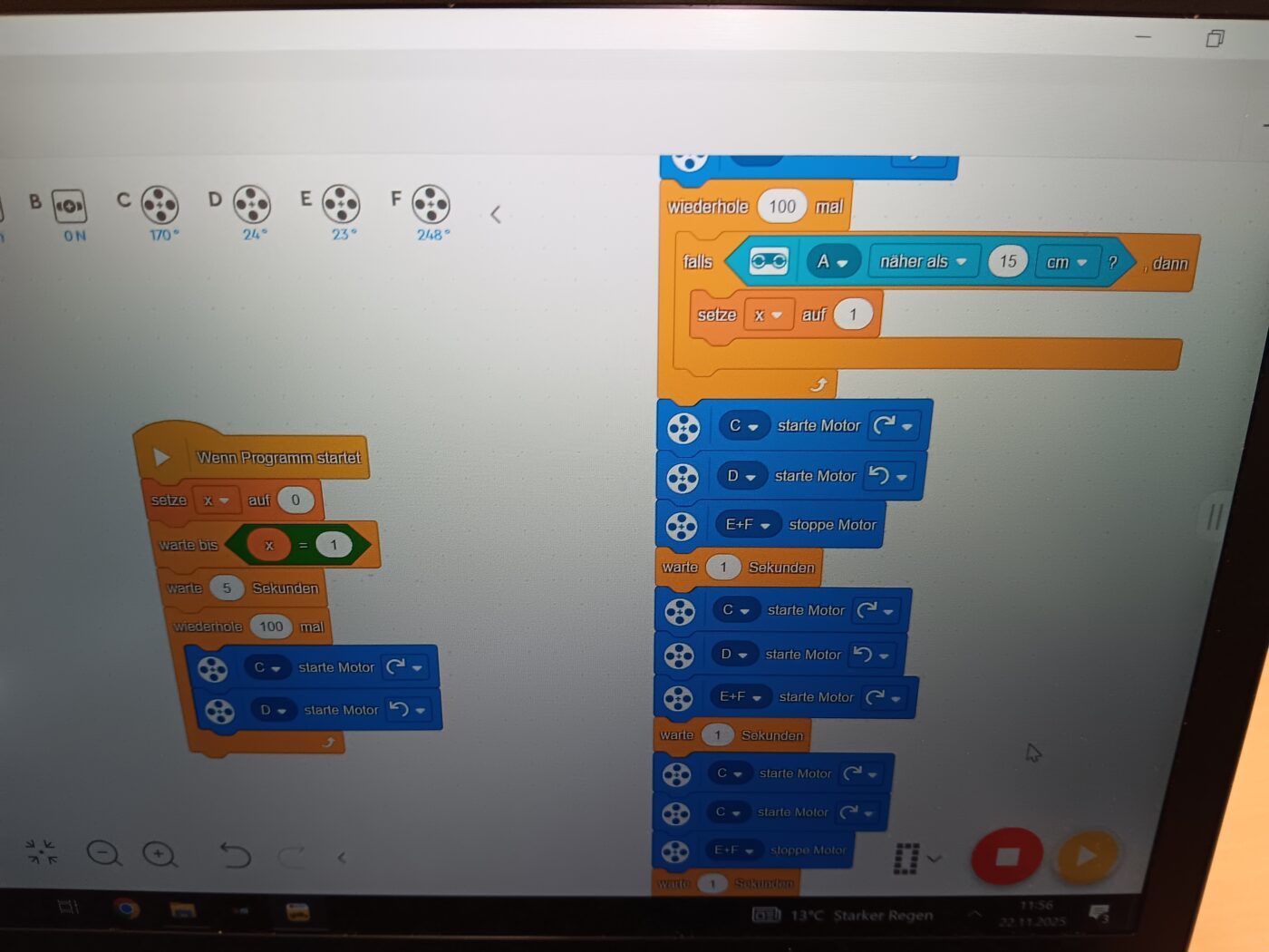 Das Code Camp am Sonntag begann mit der Konstruktion einer Farbsensoruhr, bei der der Roboter zum einen Farben erkennen und zuordnen musste: rot und weiß sollten als solche benannt, jegliche andere Farben als „bunt“ angezeigt werden. Zudem sollte der Roboter mitzählen und nach der fünften Farbe ein Smiley auf dem verbauten Display anzeigen. Hierzu war die Programmierung mit Variablen nötig: beim Start des Programms wurde diese auf „0“ gesetzt. Bei jeder erkannten Farbe wird ein Punkt hinzuaddiert, so dass nur eine eigene kleine Schleife „wenn x=5, dann zeige ein Smiley auf dem Display an“ dem Programm hinzugefügt werden musste. Die Schülerinnen und Schüler entwickelten diese Lösung dabei selbstständig und stellten sie sich im Team vor, bevor sie mit ihren Urkunden und Preisen nach Hause gingen. Das Code Camp bewies daher den vollständig zutreffenden Ausspruch von John Cleese: „Wenn du kreative ArbeiterInnen willst, gib ihnen genug Zeit zum Spielen.“